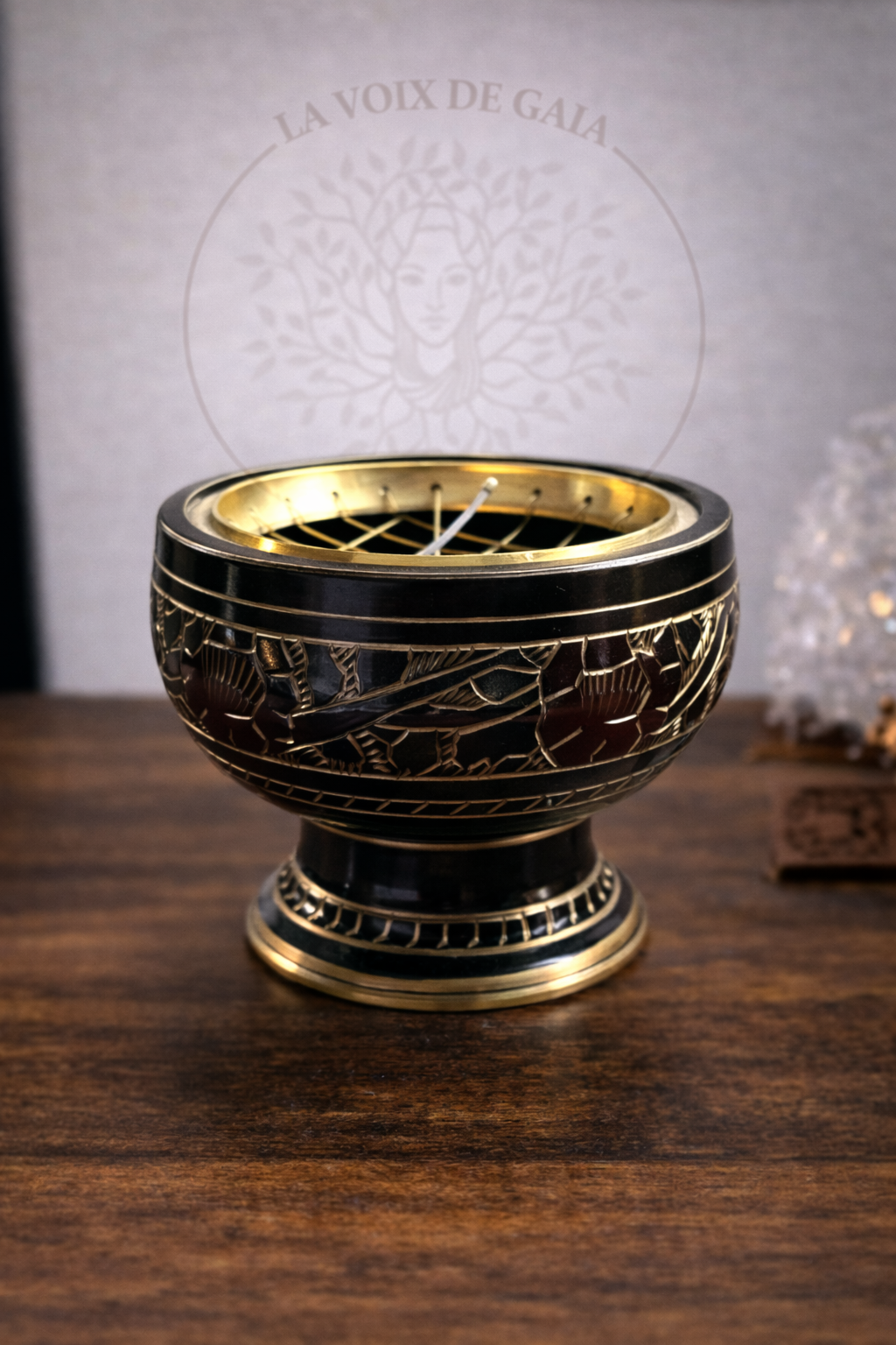 Brûle-Encens en Laiton Noir Ciselé avec Grille